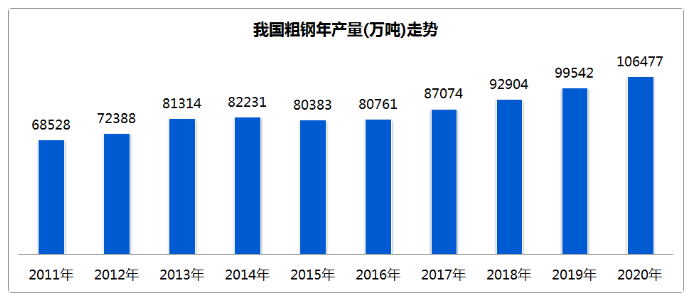 2020年全球粗鋼產(chǎn)量為18.64億噸,我國粗鋼產(chǎn)量達(dá)到了10.64億噸,占了全球產(chǎn)量的56%以上,相對10年前產(chǎn)量接近翻了一番。