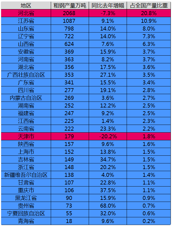 而根據(jù)國家統(tǒng)計(jì)局最新公布的數(shù)據(jù),今年5月份我國粗鋼產(chǎn)量達(dá)到9945萬噸,同比增長6.6%,1-5月累計(jì)產(chǎn)量47310萬噸,同比增長13.9%。其中,河北省以2068萬噸排第一,占全國總產(chǎn)量的20.8%。除了河北和天津粗鋼產(chǎn)量有所下降外,其他行政區(qū)的粗鋼產(chǎn)量仍在不同程度地增長。