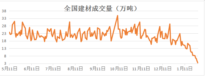 本周建材成交量持續(xù)下降,全國建材日均成交僅6萬噸,周五更是下降至全年低位3.38萬噸。下游工地已進(jìn)入全面停工狀態(tài),商家逐步離場,成交持續(xù)清淡,市場將進(jìn)入有價無市的階段。