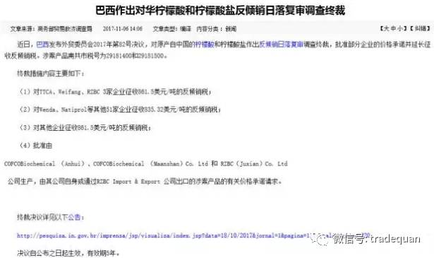 近日,巴西發(fā)布外貿(mào)委員會(huì)2017年第82號(hào)決議,對(duì)原產(chǎn)自中國(guó)的檸檬酸和檸檬酸鹽作出反傾銷日落復(fù)審調(diào)查終裁,批準(zhǔn)部分企業(yè)的價(jià)格承諾并延長(zhǎng)征收反傾銷稅。涉案產(chǎn)品南共市稅號(hào)為29181400和29181500。