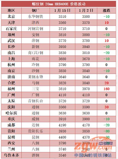 根據(jù)中鋼網(wǎng)數(shù)據(jù),以1月份螺紋鋼的波動(dòng)來(lái)看,全國(guó)多數(shù)市場(chǎng)波幅在10-30,僅貴陽(yáng)和福州地區(qū)有較大波動(dòng),其中貴陽(yáng)跌幅達(dá)到80,福州漲幅達(dá)到160。