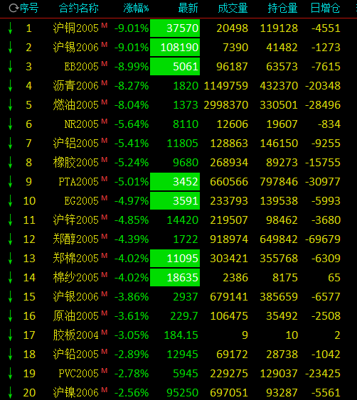 以銅為代表的有色金屬昨日午后暴跌,價格創(chuàng)下多年以來新低。今日國內(nèi)期市收盤繼續(xù)是多數(shù)下挫的局面,有色金屬、化工期貨跌幅居前,滬銅、滬錫、苯乙烯、PTA、乙二醇、鄭棉、棉紗等7個品種跌停。瀝青、燃油跌逾8%,滬鋁、橡膠跌逾5%。貴金屬均下跌,滬金跌逾1%,滬銀跌近4%。