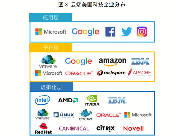 在虛擬化層,美國科技企業(yè)在全球具有壟斷性技術(shù)優(yōu)勢,這些企業(yè)在技術(shù)版圖上呈現(xiàn)階梯型分布:首先,Intel、AMD、Nvidia和IBM作為芯片制造商,提供芯片架構(gòu)與處理器指令集的虛擬化技術(shù);其次,威睿(VMware)、微軟、Linux基金會(美國非盈利組織掌握Linux內(nèi)核開發(fā))提供操作系統(tǒng)內(nèi)核虛擬化技術(shù);在被業(yè)內(nèi)稱為輕量級虛擬化技術(shù)的容器技術(shù)領(lǐng)域,也有Docker這樣的美國企業(yè)占據(jù)市場主導(dǎo)地位;最后,還有甲骨文、紅帽(Red Hat,隸屬IBM旗下)、Canonical、思杰(Citrix)、網(wǎng)威(Novell)提供企業(yè)級虛擬化產(chǎn)品。