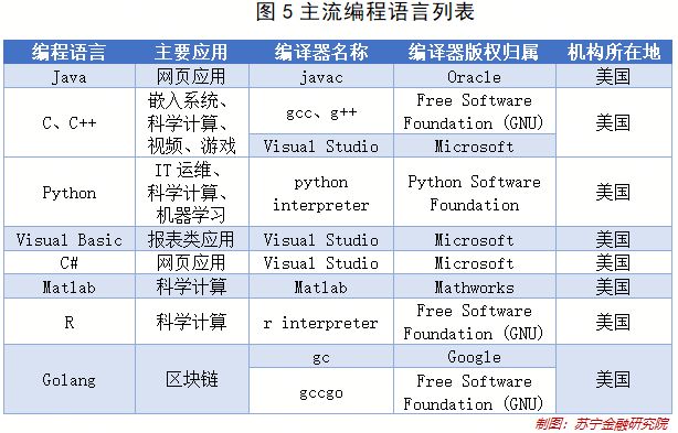 在這些編程語言當(dāng)中,有很多已成為國際標(biāo)準(zhǔn)。需要指出的是,雖然語言本身已成為國際標(biāo)準(zhǔn),但其具體實(shí)現(xiàn)(專業(yè)術(shù)語叫編譯器)還是有版權(quán)的。以下表格匯總了上述編程語言的主要應(yīng)用場景、主流編譯器、以及版權(quán)歸屬情況。從中可以看到,這些語言的主流編譯器的版權(quán)均為美國公司或美國非盈利機(jī)構(gòu)所有。
