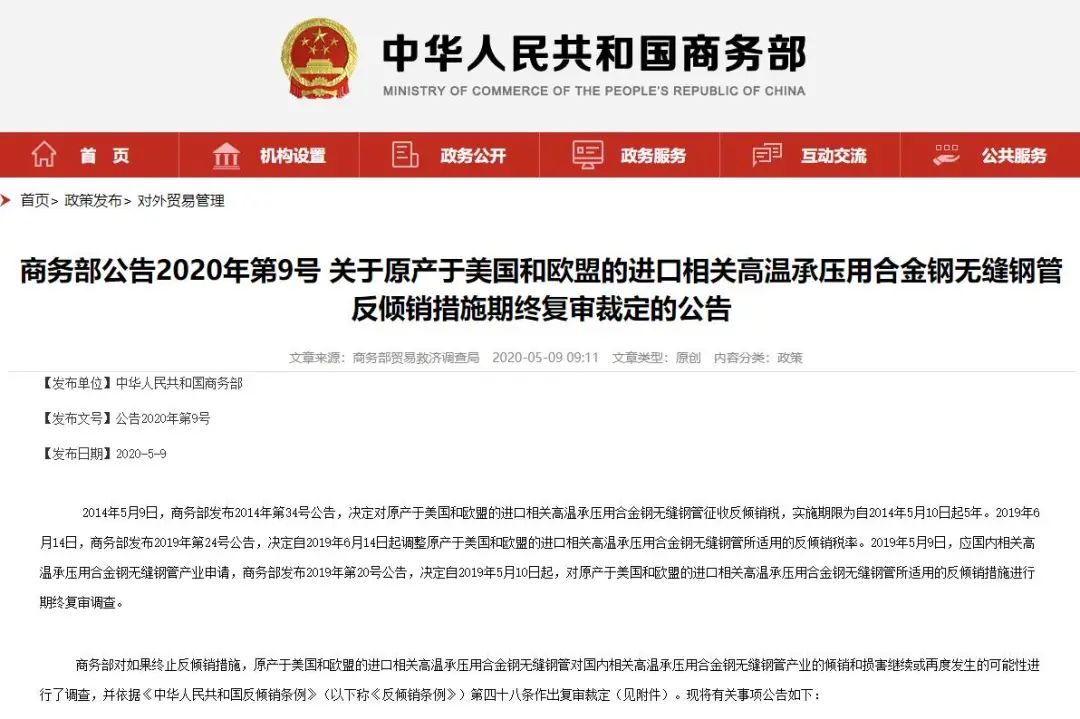 商務(wù)部公告2020年第9號 關(guān)于原產(chǎn)于美國和歐盟的進口相關(guān)高溫承壓用合金鋼無縫鋼管反傾銷措施期終復(fù)審裁定的公告