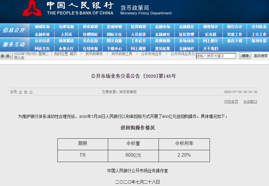 800億逆回購 凈投放700億