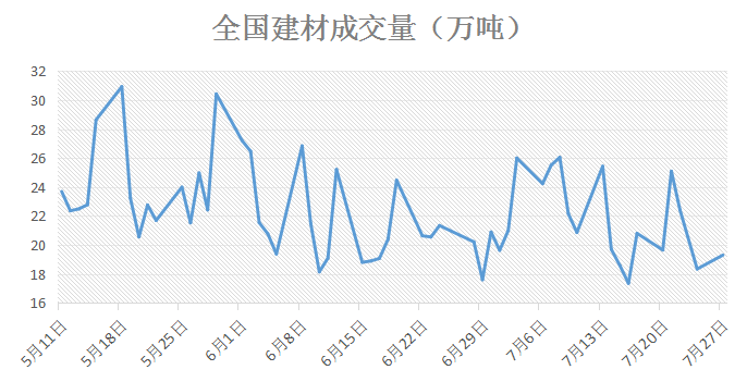 隨著價格的回落,且臨近月底,市場觀望情緒回升,建材成交量低于20萬噸,持續(xù)低位徘徊,南方部分地區(qū)仍受洪澇影響,下游商家采購積極性不高,需求的釋放仍受影響。