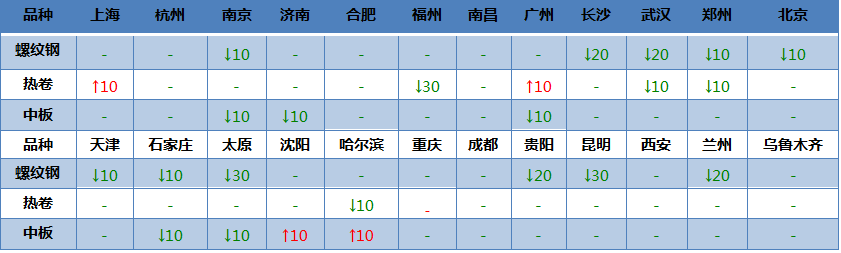 現(xiàn)貨方面,成交一般,商家出貨為主,建材弱于板材,螺紋鋼24個市場中12個市場下跌10-30,均價下調(diào)8;熱卷24個市場中3個市場下跌10-30,2個市場上漲10,均價下調(diào)2;中板24個市場中6個市場下跌10,2個市場上漲10,均價下調(diào)1。