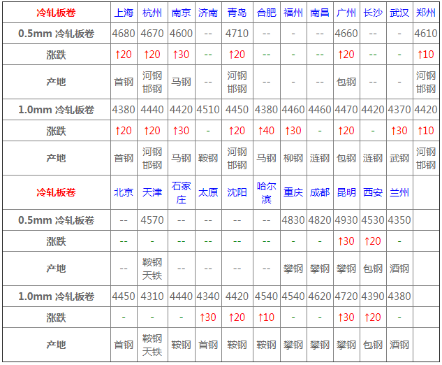 受關(guān)聯(lián)期貨上揚提振,商家心態(tài)普遍尚好,以漲為主。由于前端時間資源成本普遍偏高,故商家訂貨意愿不大,導(dǎo)致目前市場馬鋼、寶武鋼庫存偏低位運行,其余資源規(guī)格尚可,綜合考慮,后期市場資源到庫較少,高成本支撐下。預(yù)計短期冷軋卷板價格偏強震蕩。