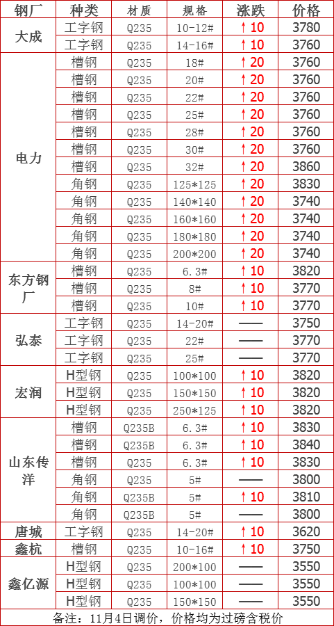 2023年11月4日全國鋼材價格漲跌圖!33家鋼廠全漲!預(yù)測:又要漲了!