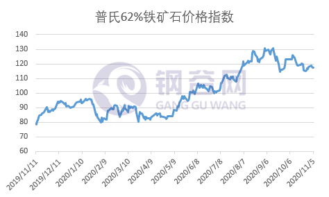 本周進(jìn)口礦價(jià)格弱勢(shì)運(yùn)行。截止周五曹妃甸港PB粉價(jià)格為845元/噸,較上周降13元/噸;日照港841元/噸,較上周降18元/噸;京唐港848元/噸,較上周降15元/噸;連云港844元/噸,較上周降21元/噸。截止周四62%普氏鐵礦指數(shù)117.45美元/噸,較上周跌0.50美元/噸。受華北部分地區(qū)環(huán)保限產(chǎn)推進(jìn),疊加部分高爐計(jì)劃?rùn)z修,燒結(jié)機(jī)關(guān)停影響,國(guó)內(nèi)高爐開工率下降趨勢(shì),鋼廠鐵礦石采購(gòu)量有所下降。而港口鐵礦石庫(kù)存不斷上升,鋼企并不急于囤貨,隨著北方地區(qū)氣溫逐漸下降,貿(mào)易商仍在積極出貨,短期進(jìn)口礦價(jià)格或窄幅震蕩運(yùn)行。