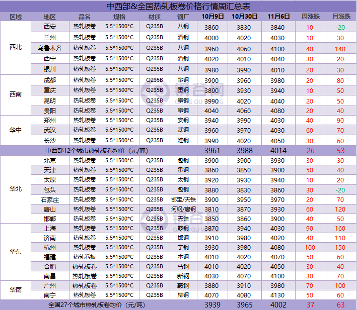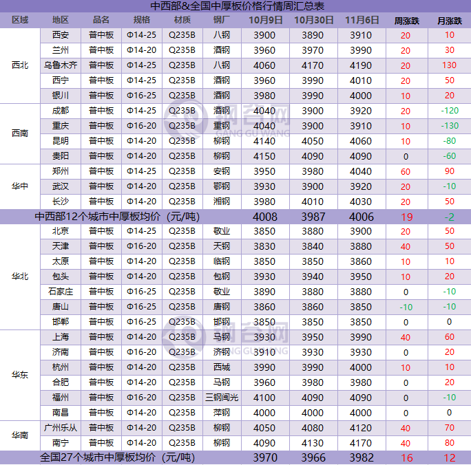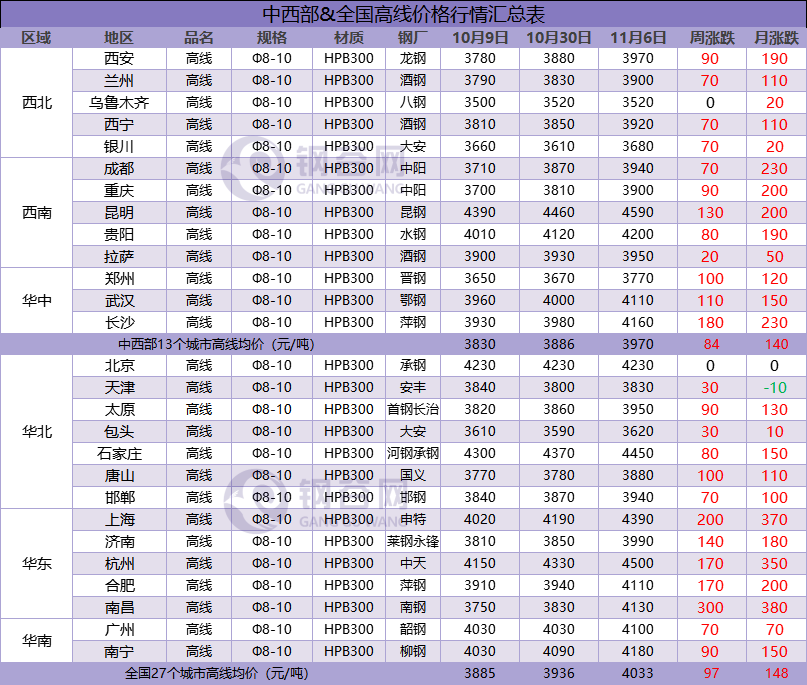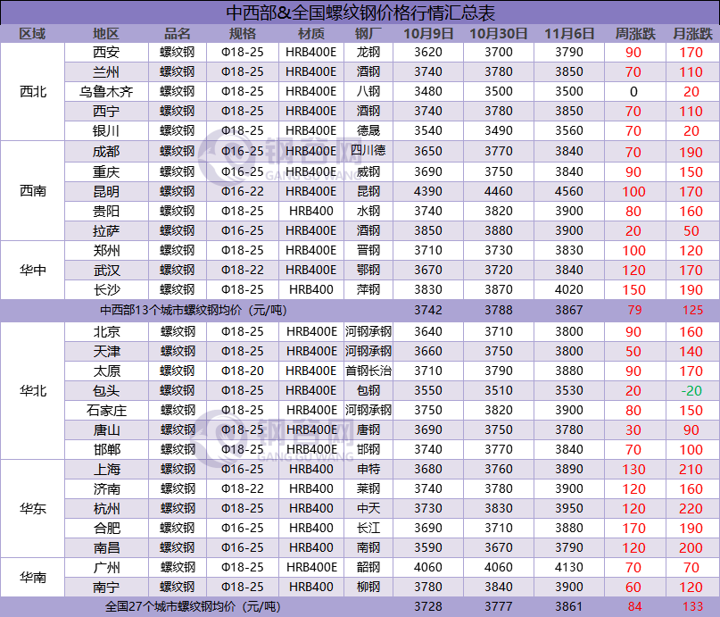 【周評(píng)】鋼坯震蕩走高,廢鋼強(qiáng)勢(shì)上行! 全國(guó)建筑鋼材成交價(jià)格周/月匯總表(10.9-10.30-11.6)