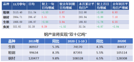 今年粗鋼和鋼材產(chǎn)量持續(xù)創(chuàng)新高,盡管10月產(chǎn)量小幅回落,但仍處于歷史高位水平。且隨著鋼價拉漲,利潤回升,鋼廠增產(chǎn)動力加強(qiáng),近一周高爐開工率有所回升。且全年鋼產(chǎn)量,粗鋼和鋼材將實現(xiàn)“雙十億噸”。