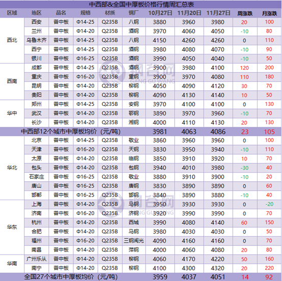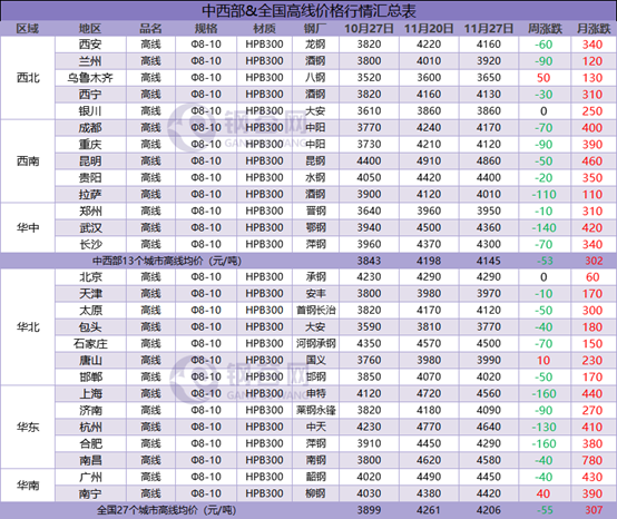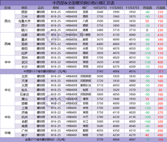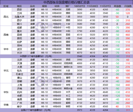 據(jù)鋼谷網(wǎng)數(shù)據(jù)監(jiān)測(cè),本周全國(guó)主要城市鋼材市場(chǎng)價(jià)格盤(pán)整運(yùn)行,調(diào)整空間10-160元/噸,板材強(qiáng)于長(zhǎng)材。截止11月27日,全國(guó)27個(gè)城市螺紋鋼均價(jià)4007元/噸,較上周跌57元/噸;全國(guó)27個(gè)城市高線(xiàn)均價(jià)4206元/噸,較上期跌55元/噸;全國(guó)27個(gè)城市盤(pán)螺均價(jià)4284元/噸,較上期跌55元/噸;全國(guó)27個(gè)城市熱軋板卷均價(jià)4134元/噸,較上周漲20元/噸;全國(guó)27個(gè)城市中厚板均價(jià)4051元/噸,較上期漲14元/噸。