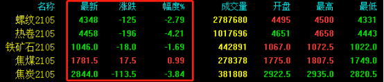 期鋼今日大跌,期螺下跌125收?qǐng)?bào)4348,期卷下跌196收?qǐng)?bào)4458,鐵礦石下跌18收?qǐng)?bào)1046,焦煤上漲17.5收?qǐng)?bào)1781.5,焦炭下跌3.84收?qǐng)?bào)2844。