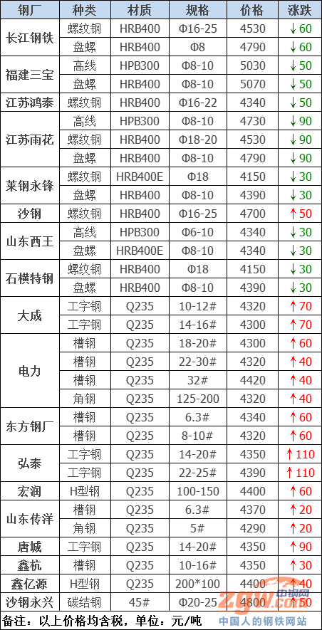 據(jù)數(shù)據(jù)監(jiān)測(cè),今日共28家鋼廠調(diào)價(jià),其中漲幅最高為弘泰工字鋼,調(diào)價(jià)幅度110元/噸,跌幅最大為江蘇雨花建材,調(diào)價(jià)幅度90元/噸,具體調(diào)價(jià)明細(xì)如下: