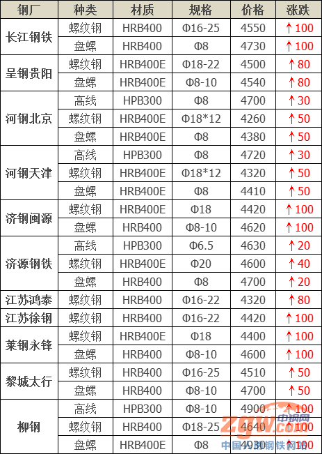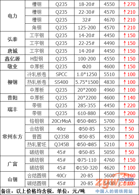 今日據(jù)統(tǒng)計的35家鋼廠調(diào)價,漲幅最高為電力槽鋼,調(diào)價幅度270元/噸,具體調(diào)價明細(xì)如下: