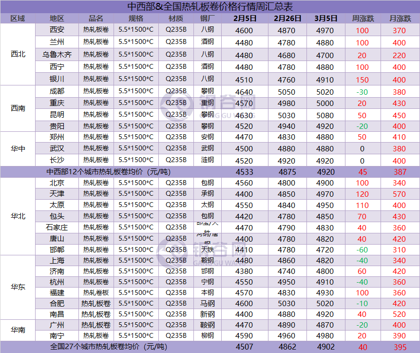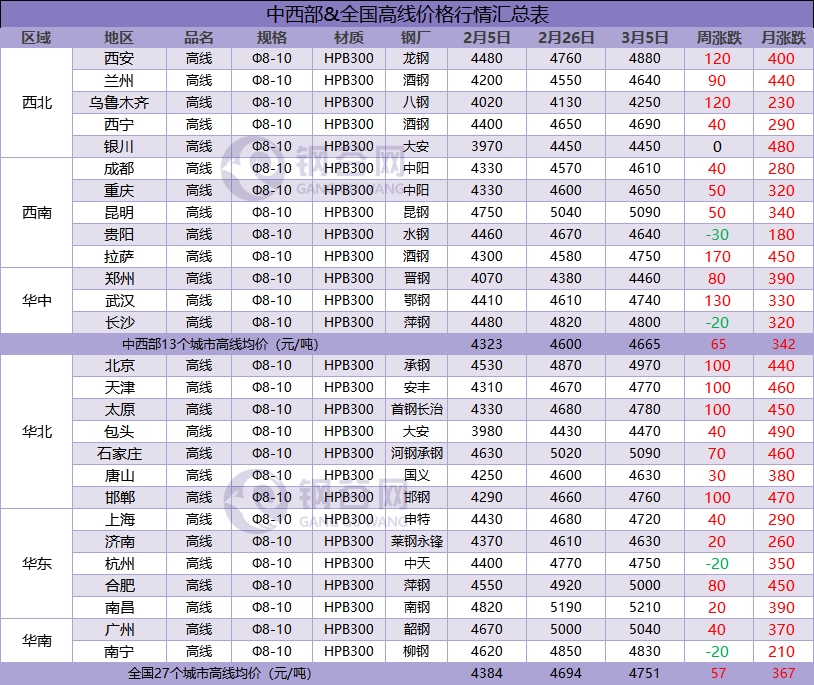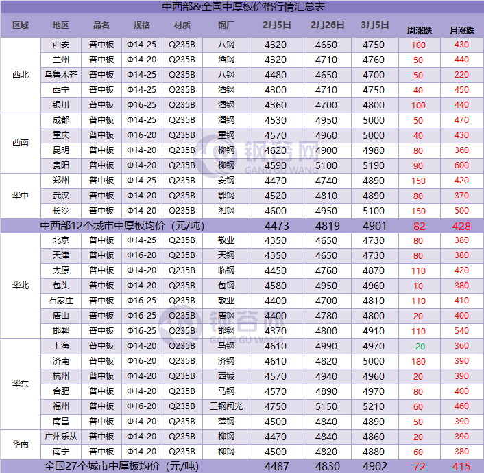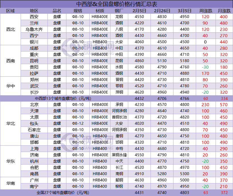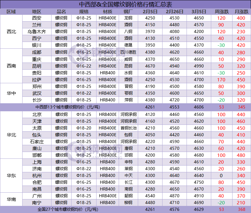 據(jù)鋼谷網(wǎng)數(shù)據(jù)監(jiān)測(cè),本周全國(guó)主要城市鋼材市場(chǎng)價(jià)格整體上漲,漲幅10-230元/噸。截止3月5日,全國(guó)27個(gè)城市螺紋鋼均價(jià)4629元/噸,較上周漲53元/噸;全國(guó)27個(gè)城市高線均價(jià)4751元/噸,較上期漲57元/噸;全國(guó)27個(gè)城市盤(pán)螺均價(jià)4803元/噸,較上期漲63元/噸;全國(guó)27個(gè)城市熱軋板卷均價(jià)4902元/噸,較上周漲40元/噸;全國(guó)27個(gè)城市中厚板均價(jià)4902元/噸,較上期漲72元/噸。