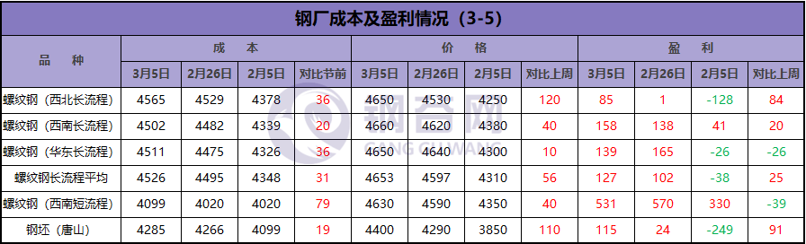 本周螺紋鋼成本小漲,價(jià)格大漲,利潤(rùn)較上周擴(kuò)大。本周鐵礦石價(jià)格小漲,焦炭持穩(wěn)回調(diào),廢鋼上漲,整體上長(zhǎng)流程螺紋鋼成本較上周大幅抬升31元/噸;螺紋鋼價(jià)格大幅上漲,總體上鋼廠平均利潤(rùn)上升25元/噸。西南地區(qū)短流程鋼廠螺紋鋼成本上漲,價(jià)格小漲,利潤(rùn)于上周小幅回落。唐山鋼坯鋼廠生產(chǎn)成本抬升19元/噸,鋼坯利潤(rùn)較上周大幅上升91元/噸。