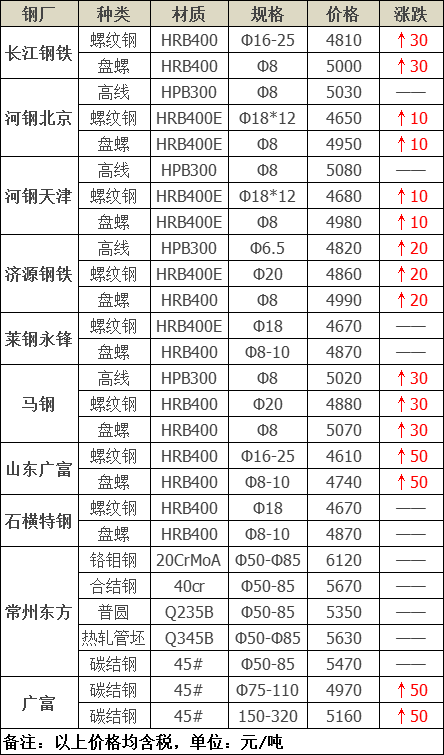 1、華東市場(chǎng)上調(diào)50元/噸:角鋼5180元/噸,槽鋼5140元/噸,工字鋼5140元/噸;