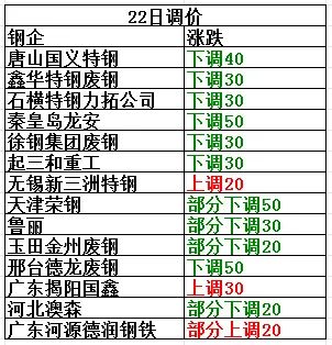 22日唐山國義特鋼下調(diào)40:坯子頭小鐵餅3310,剪切鋼筋頭3330,薄邊角料3220,邊角料3220,輥剪料3190,管子頭3130,不含稅。