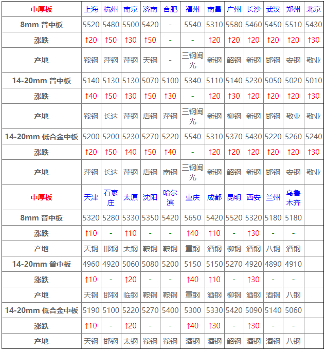 今日中厚板市場(chǎng)價(jià)格穩(wěn)后上調(diào),期貨市場(chǎng)一路攀升,商家隨行上調(diào)價(jià)格,市場(chǎng)鮮有成交,考慮成本端高位支撐,預(yù)計(jì)短期偏強(qiáng)整理。