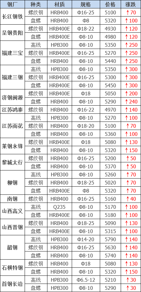 今日據(jù)統(tǒng)計(jì)的38家鋼廠調(diào)價(jià),漲幅最高為福建三鋼建材,調(diào)價(jià)幅度300元/噸,具體調(diào)價(jià)明細(xì)如下: