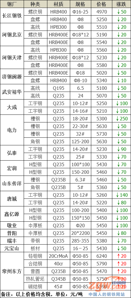據(jù)數(shù)據(jù)監(jiān)測(cè),今日共22家鋼廠調(diào)價(jià),其中漲幅最高為常州東方優(yōu)鋼,調(diào)價(jià)幅度20元/噸,跌幅最大為電力槽鋼,調(diào)價(jià)幅度250元/噸,具體調(diào)價(jià)明細(xì)如下:
