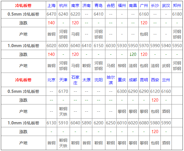 今全國(guó)冷軋市場(chǎng)漲跌穩(wěn)均現(xiàn),幅度10-70元,華中冷軋交投氛圍稍有好轉(zhuǎn),僅個(gè)別地區(qū)有暗降情況,優(yōu)惠幅度10-20左右,終端按需拿貨,整體成交平淡;