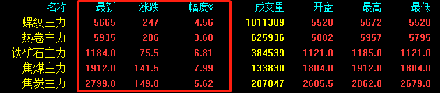 節(jié)后第一個(gè)交易日,期鋼跳空高開,大幅拉漲。期螺上漲247收報(bào)5665,期卷上漲206收報(bào)5935,鐵礦石上漲75.5收報(bào)1184,焦煤上漲141.5收報(bào)1912,焦炭上漲149收報(bào)2799。