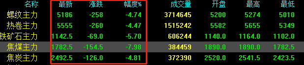 期鋼大跳水,期螺下跌258收?qǐng)?bào)5186,期卷下跌260收?qǐng)?bào)5555,鐵礦石下跌69收?qǐng)?bào)1142.5,焦煤下跌154.5收?qǐng)?bào)1782.5,焦炭下跌126收?qǐng)?bào)2492.5。