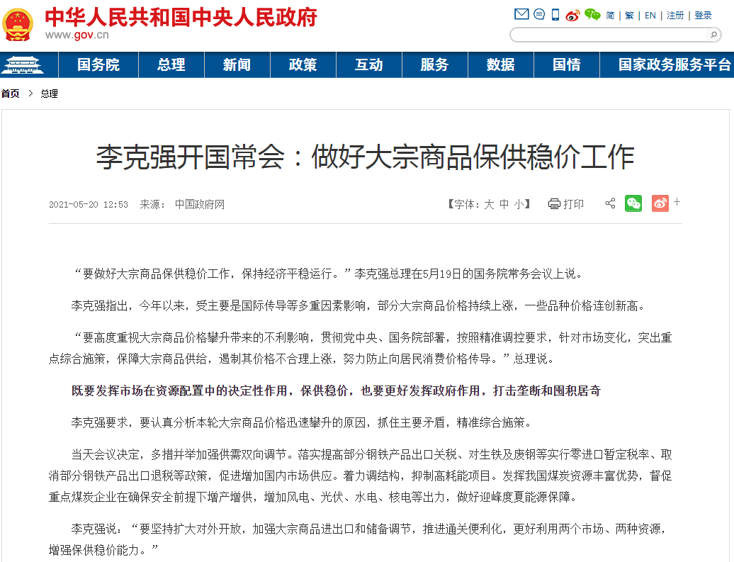 另一方面,國(guó)務(wù)院常務(wù)會(huì)議中,再次強(qiáng)調(diào)要做好大宗商品保供穩(wěn)價(jià)工作,“既要發(fā)揮市場(chǎng)在資源配置中的決定性作用,保供穩(wěn)價(jià),也要更好發(fā)揮政府作用,打擊壟斷和囤積居奇?!?/p>