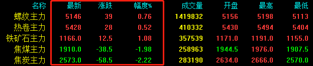 期螺上漲39收?qǐng)?bào)5146,期卷上漲28收?qǐng)?bào)5428,鐵礦石上漲12.5收?qǐng)?bào)1166,焦煤下跌38.5收?qǐng)?bào)1910,焦炭下跌58.5收?qǐng)?bào)2573。