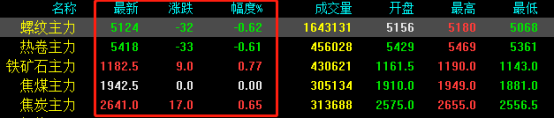 今日期鋼走弱,臨近收盤(pán),下跌幅度有所放緩。期螺下跌32收?qǐng)?bào)5124,期卷下跌33收?qǐng)?bào)5418,鐵礦石上漲9收?qǐng)?bào)1182.5,焦煤價(jià)格持穩(wěn),焦炭上漲17收?qǐng)?bào)2641。