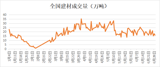 本周建材日均成交量?jī)H17萬(wàn)噸,最高成交量也僅在19萬(wàn)噸,較旺季需求下降超三成。從市場(chǎng)反饋來(lái)看,下游觀望情緒較濃,且受雨季影響,采購(gòu)意愿不高,成交偏弱,鋼價(jià)整體承壓。