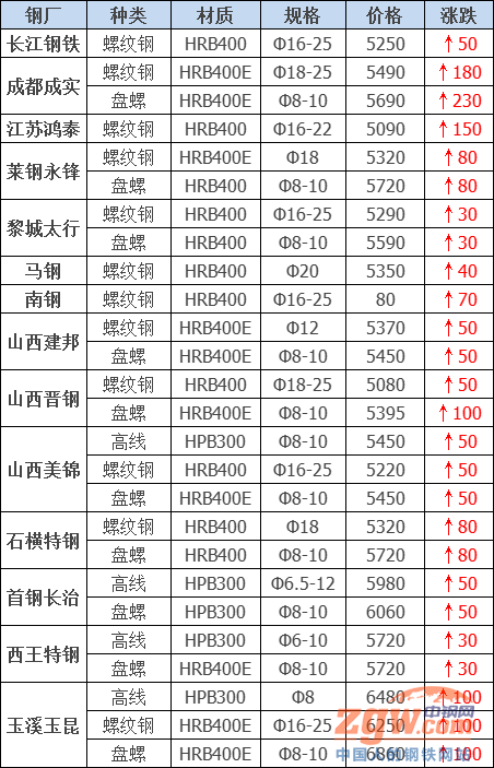 據(jù)數(shù)據(jù)監(jiān)測(cè),今日共28家鋼廠調(diào)價(jià),其中漲幅最高為成都成實(shí)盤螺,調(diào)價(jià)幅度230元/噸,具體調(diào)價(jià)明細(xì)如下: