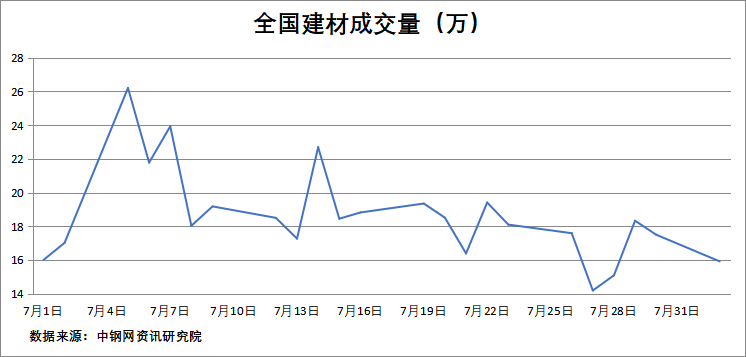 近期全國建材成交量持續(xù)處于低位,日成交多次低于16萬噸,較7月初日成交量下降10萬噸左右。高溫、暴雨、疫情等影響下,終端需求量短期內(nèi)難有回升,利空鋼價走勢。