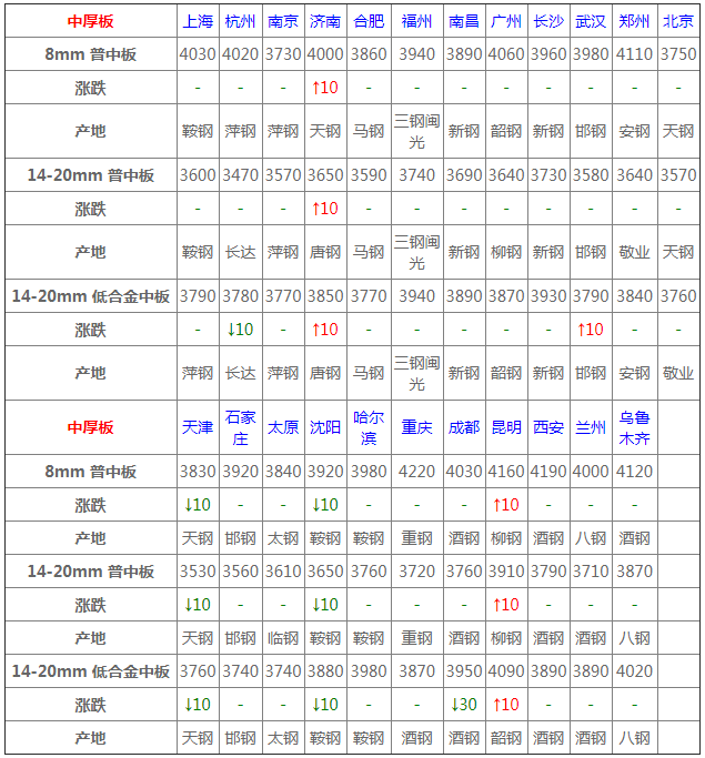今現(xiàn)貨價格穩(wěn)中趨弱。從市場了解的情況來看,今日受期貨下降影響,早盤現(xiàn)貨詢盤氛圍冷清,商家心態(tài)謹(jǐn)慎,下游整體情緒一般,后市來看,商家挺價意愿偏低,預(yù)計短期內(nèi)中厚板市場價格窄幅弱調(diào)。