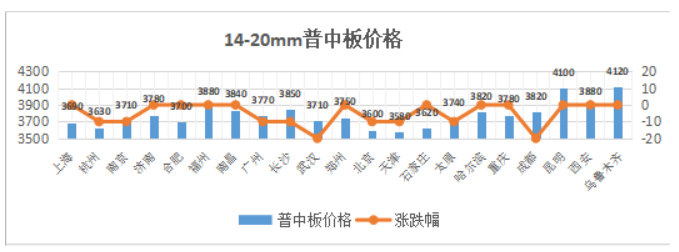 【中板】中板跌幅10-20,全國21個主要市場14-20mm普中板平均價格3780元/噸,較上個交易日下調(diào)5元/噸。