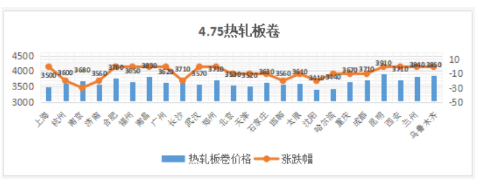 【熱卷】熱卷跌幅10-20,全國24個主要市場4.75熱軋板卷平均價格3649元/噸,較上個交易日下調(diào)9元/噸。