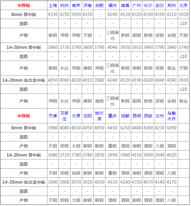 中板24個市場中1個市場下跌10,14-20mm普中板平均價格3865元/噸,較上個交易日價格相同。