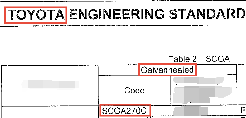 SCGA270C:豐田汽車的車廠牌號,新鐵合金鍍層,英文Galvannealed。