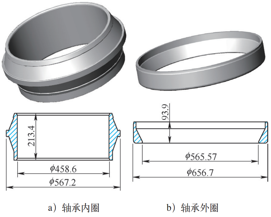 大型軸承圈是一種結(jié)構(gòu)相對復(fù)雜、截面尺寸變化相對劇烈、具有薄壁刃口的大直徑薄壁零件,在進(jìn)行熱處理時,必須最大限度地利用爐容,同時必須減小熱處理變形,以保證產(chǎn)品合格率,這類軸承圈形狀尺寸多種多樣,這里僅選取兩種典型樣例。圖1a為某軸承內(nèi)圈,最大壁厚54.3mm,薄壁刃口只有16.4mm。圖1b為某軸承外圈,最大壁厚45.56mm,薄壁刃口只有10.95mm。