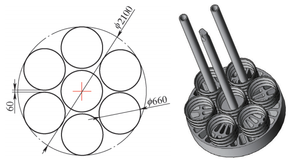 該軸承為雙列圓錐滾子軸承,每套軸承圈含2只軸承外圈和1只軸承內(nèi)圈,客戶也按此比例來料加工。450kW井式熱處理爐導(dǎo)流筒最大尺寸φ2300mm×3500mm,實際裝料時直徑方向單邊預(yù)留100mm安全余量,高度方向預(yù)留100mm安全余量。按此規(guī)格實際裝料應(yīng)控制在φ2100mm×3400mm圓柱體積內(nèi)。每只軸承圈中軸承外圈直徑最大,按φ660mm估算一個平層內(nèi)擺7只,可發(fā)揮最大爐容。為保證高層碼垛時的穩(wěn)定性,每串碼垛中心設(shè)一中心導(dǎo)向立柱,如圖2所示。