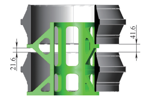 軸承內(nèi)圈總高為213.4mm,考慮到熱處理加熱溫度下:①鋼鐵部件會有一定的膨脹量。②長期使用的情況下工裝會變形從而導(dǎo)致料盤碼垛傾斜。因此,碼垛層之間必需預(yù)留一定的變形空間,但該尺寸不宜大,否則影響碼垛層數(shù),綜合考慮后確定中心托架的總高控制在255mm,這樣2只軸承圈之間有41.6mm的間隙,軸承圈與托架支壁的最小間隙還有21.6mm(見圖3),從而保證了碼垛安全。