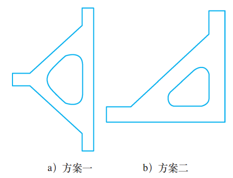 托架支臂形式有兩種方案供選擇,如圖4所示。兩種方案中:方案一力學(xué)結(jié)構(gòu)優(yōu)于方案二,并且在熱爐試驗中方案二發(fā)生了較大尺寸的下垂變形,因此最終的設(shè)計選擇了方案一。