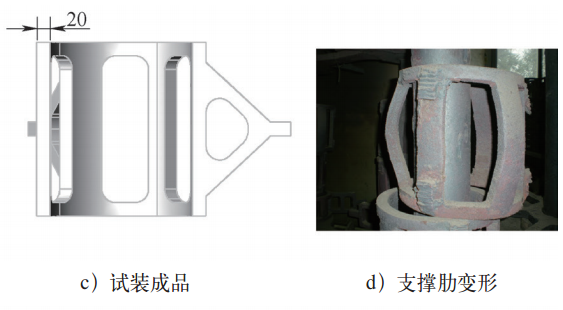 圖5c方案在熱爐試裝期間發(fā)現(xiàn)兩個問題:①支撐肋發(fā)生了較大的變形,如圖5d所示。②中心環(huán)內(nèi)徑過大,穩(wěn)定性比較好,但一旦發(fā)生歪斜,中心環(huán)保持穩(wěn)定作用不明顯。