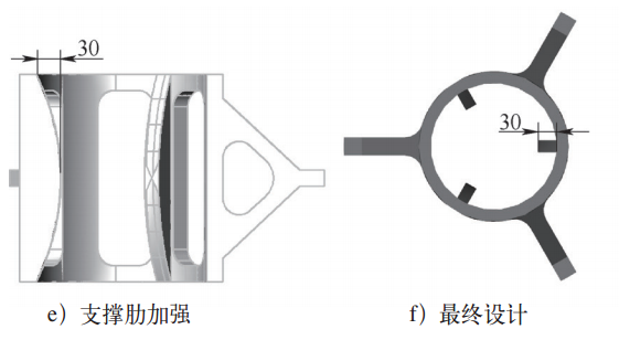 針對上述兩個實際出現(xiàn)的問題,對圖5c方案結(jié)構(gòu)進(jìn)行了改進(jìn):將中心環(huán)的3個不帶托架支臂的支撐肋改為T形結(jié)構(gòu),向中心方向凸出30mm高的肋條,肋條沿縱軸方向設(shè)計為圓弧。該方案的改進(jìn)依據(jù)是:
