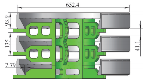 軸承外圈托架整體設(shè)計思路與內(nèi)圈托架基本一致。據(jù)此,軸承外圈單層托架的設(shè)計方案確定為:中心環(huán)內(nèi)徑210mm、壁厚20mm;托架支臂形式采用矩形框架方案。長邊中心增加一根加強(qiáng)肋,防止高溫下長邊塌縮,同時還可提高抗彎性;為減輕自重,在中心環(huán)側(cè)壁開6個減重孔,2個托架支臂之間因為中心環(huán)圓周弧長過長,所以減重孔開成2個,中間保留1個支撐肋。