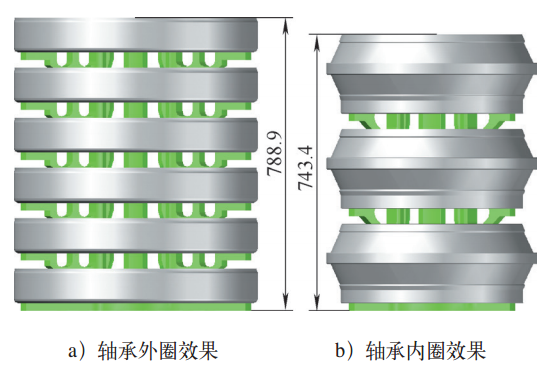 前已述及,450kW井式氣體滲碳爐實際裝料應(yīng)控制在φ2100×3400mm圓柱體積內(nèi)。水平直徑內(nèi),經(jīng)過計算,圓周方向軸承內(nèi)外圈間隔擺放,可擺放6只。中間圓心處如擺放軸承外圈,與圓周擺放的3個外圈最小間隔僅剩13mm,如用于滲碳過程,結(jié)合來料配裝,軸承在外圈比例較高時,可以在中間圓心處擺放軸承外圈;如用于滲碳后的淬火過程,考慮每只軸承圈周邊溫度場的均勻性,建議在中間圓心處擺放軸承內(nèi)圈。平面擺放布置方案如圖8a所示,最大外圓直徑2040mm,沒有超出φ2100mm的最大限制。平面擺放布置方案的三維效果如圖8b所示。